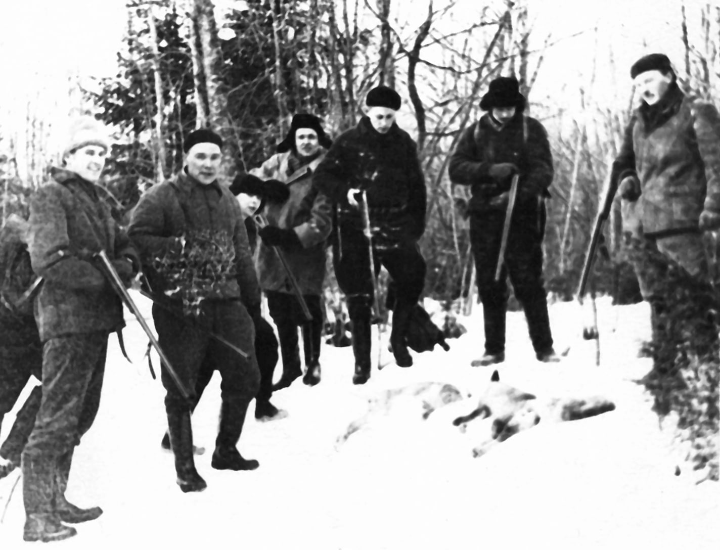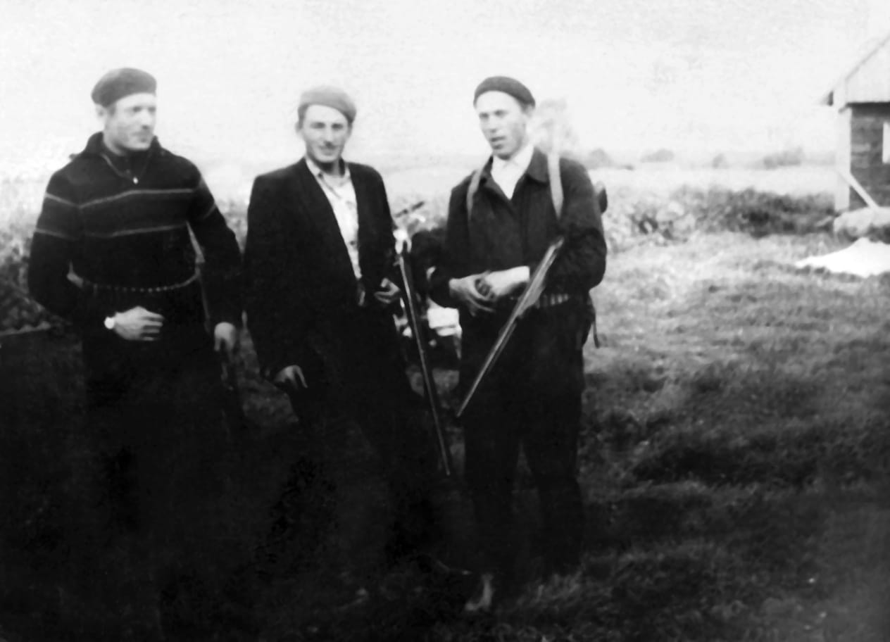 Iš kairės į dešinę Sangrūdos būrelio medžiotojai: G. Lelka, A. Kubilius, J. Žebrauskas